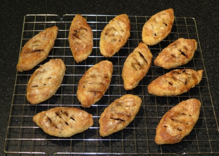 7. Press down each one gently with a rolling pin and make 3 diagonal cuts with a sharp knife on each one.