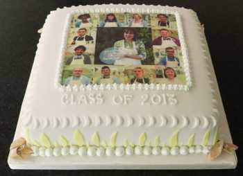 I had an edible photo print done of the bakers for the top which looks very effective and is fairly inexpensive and easy to get done. Just choose a picture or photograph and look online for suitable printers.