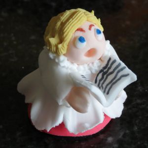 and add a tiny ball of white to the sockets and a blue centre.Make a small songbook using white sugar paste and fit on to the hands.